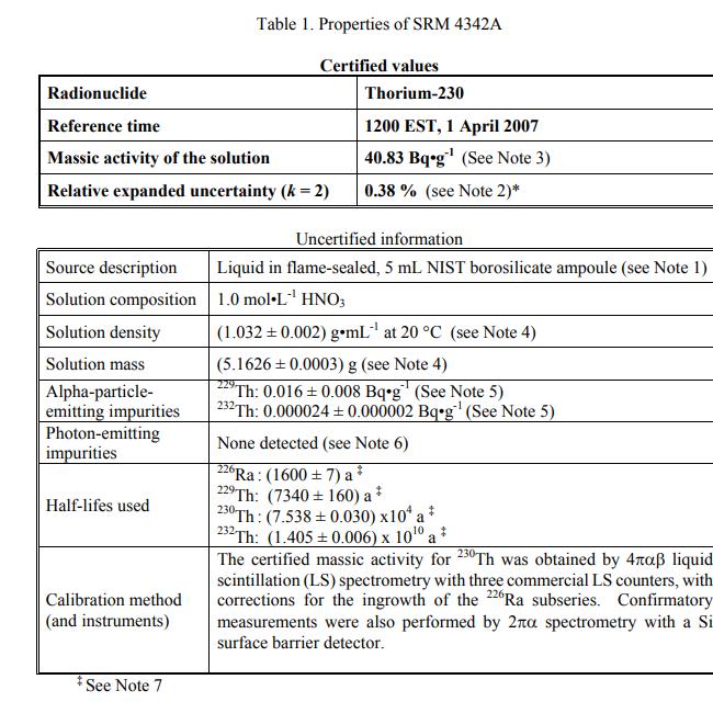 在 2007 年 4 月 1 日美國東部標(biāo)準(zhǔn)時間 1200 的參考時間,經(jīng)認(rèn)證的釷 230 質(zhì)量活度值為:(40.83 ± 0.16) Bq?g-1
