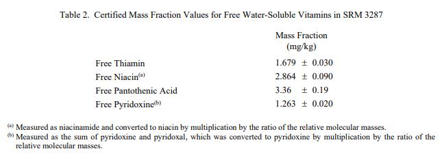 表 1 至表 3 提供了 SRM 3287 中奎尼酸、游離水溶性維生素和元素的認(rèn)證質(zhì)量分?jǐn)?shù)值,以干質(zhì)量為基礎(chǔ)報(bào)告。NIST 認(rèn)證值是NIST 對(duì)其準(zhǔn)確性的信心最高,因?yàn)樗幸阎蚩梢傻钠顏?lái)源都已考慮在內(nèi) [1]。價(jià)值分配分析由 NIST 和合作實(shí)驗(yàn)室進(jìn)行。