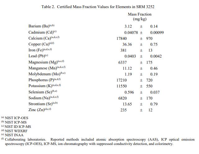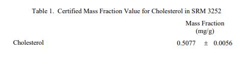 表 1 至表 3 中提供了 SRM 3252 中膽固醇、元素和維生素的認證質(zhì)量分數(shù)值,以干質(zhì)量為基礎(chǔ)報告。NIST 認證值是 NIST 認證的值對其準確性的信心最高,因為所有已知或可疑的偏差和可變性來源都已考慮在內(nèi) [1]。價值分配分析由 NIST 和合作實驗室進行。認證值計算為 NIST 方法的平均值和合作實驗室提供的平均結(jié)果的中位數(shù)(在適當?shù)那闆r下)。相關(guān)的不確定性以大約 95% 的置信水平表示 [2-4]。