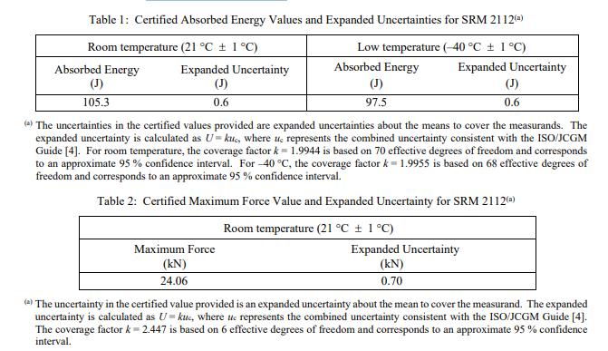 NIST 認(rèn)證值是 NIST 對(duì)其準(zhǔn)確性有最高置信度的值,因?yàn)樗幸阎蚩梢傻钠顏?lái)源都已被調(diào)查或考慮 [3]??勺匪菪允菄?guó)際單位制 (SI) 焦耳(吸收的能量)和千牛頓(力)單位。為 NIST SRM 2112動(dòng)態(tài)沖擊力驗(yàn)證樣本(標(biāo)準(zhǔn)品) 樣品確定的認(rèn)證值在表 1 和表 2 中給出。